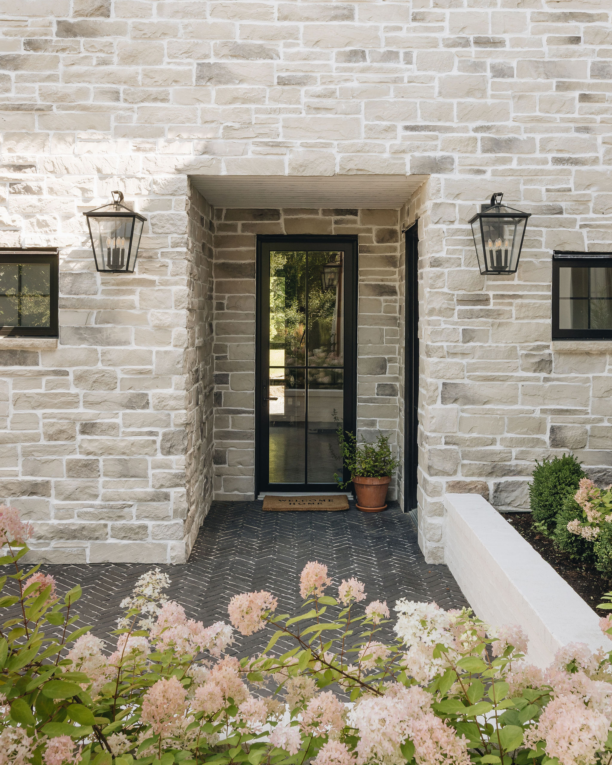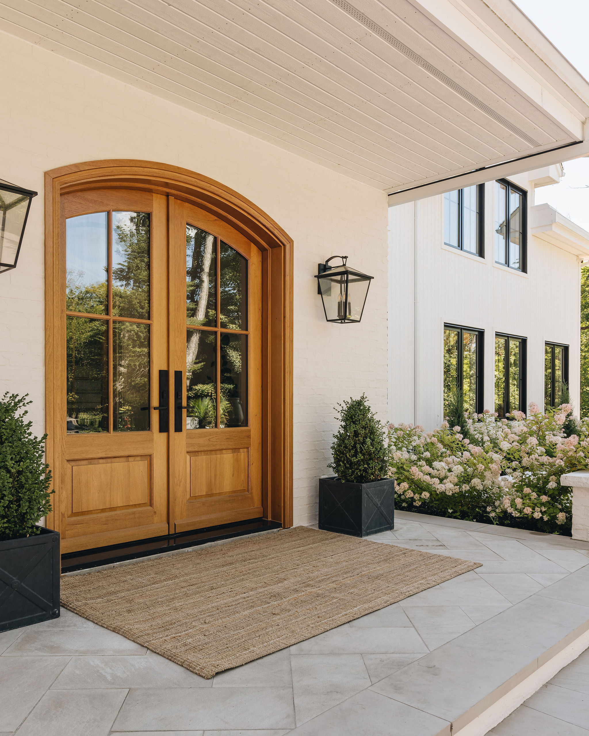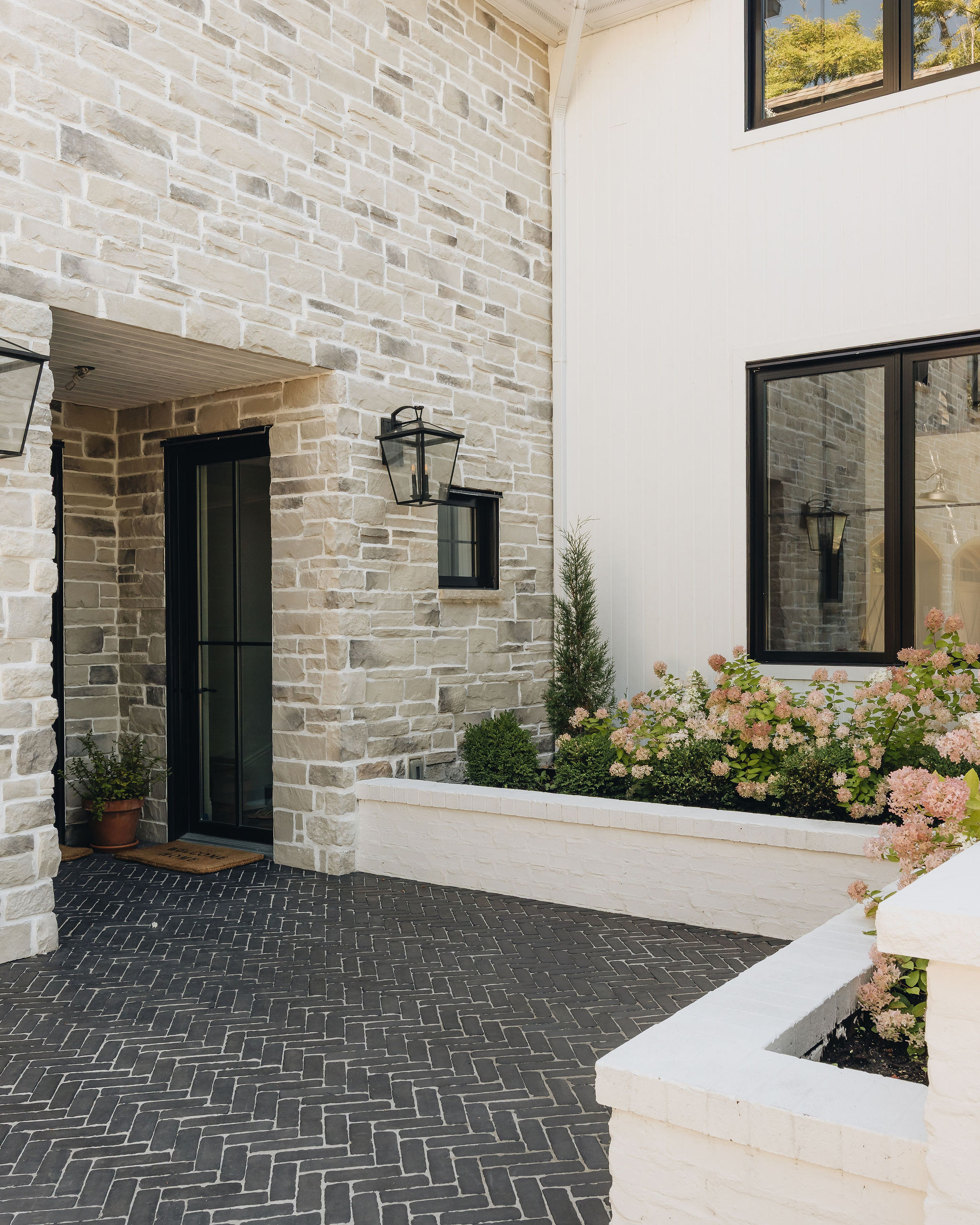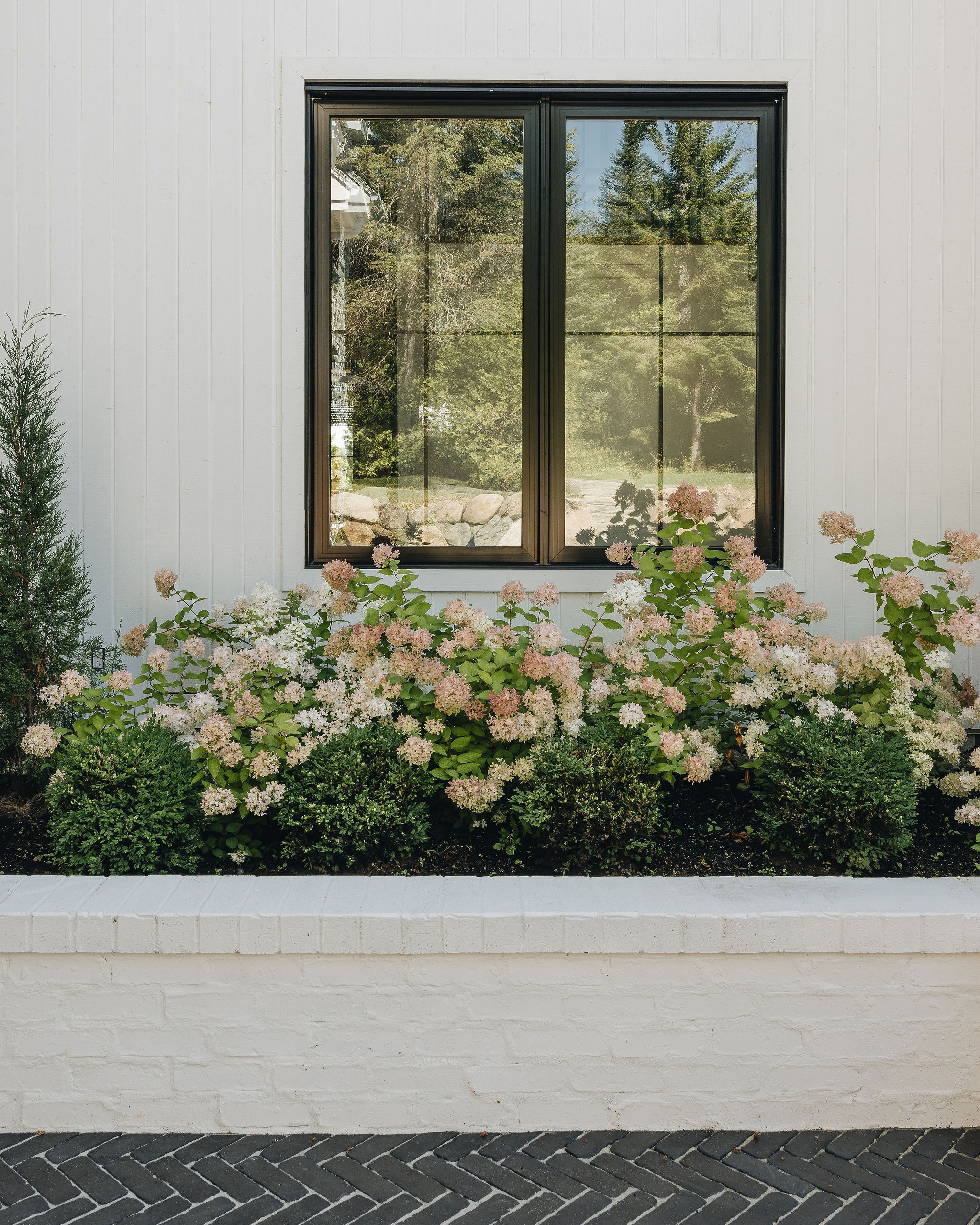 Deux ans après le design du projet Anderson, nous avons conçu un aménagement extérieur en continuité avec l’architecture et le design intérieur de la maison. Le pavé en brique noire, posé en motif herringbone, procure un charme à l’européenne et beaucoup d’élégance aux trottoirs. Les bordures et les joints de sable pâle soulignent le motif et apportent un beau contraste à l’ensemble. Les murets en brique blanche, assortis au revêtement de la maison, accueillent de magnifiques hydrangées qui se parent d’une teinte rosée à l’automne. Ces plantations structurent avec élégance l’aménagement extérieur tout en équilibrant la prestance de la façade. Le demi-cercle de pavé devant le porche fait écho aux arches de l’intérieur.
