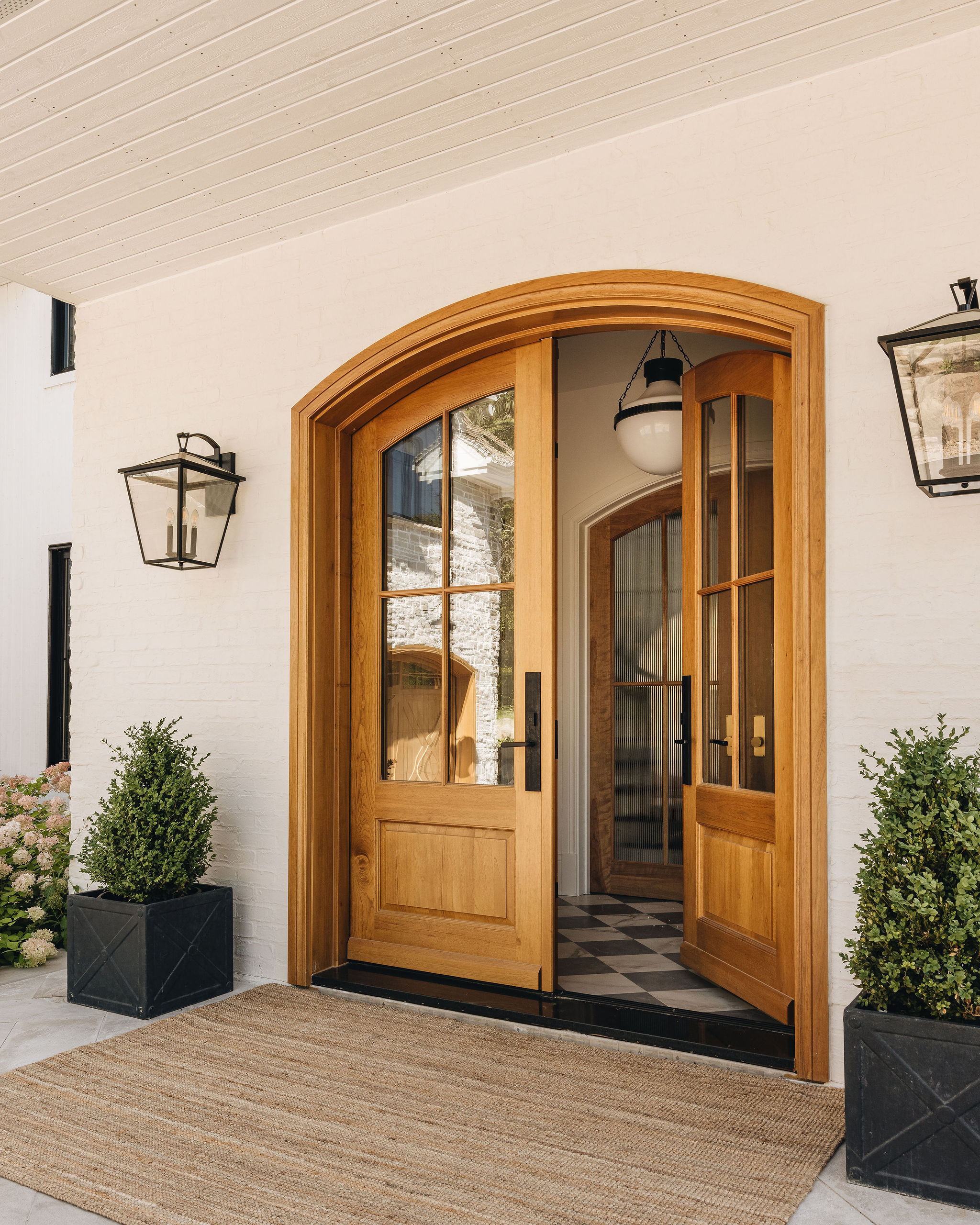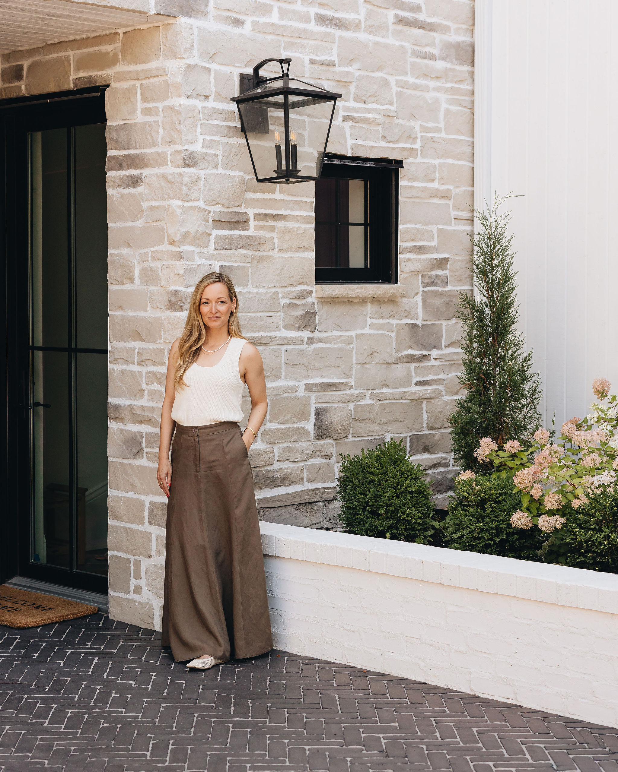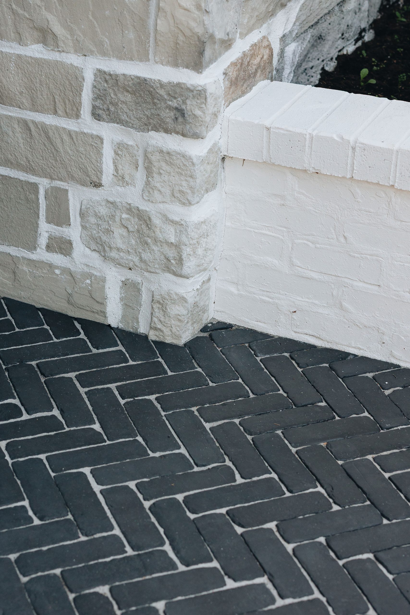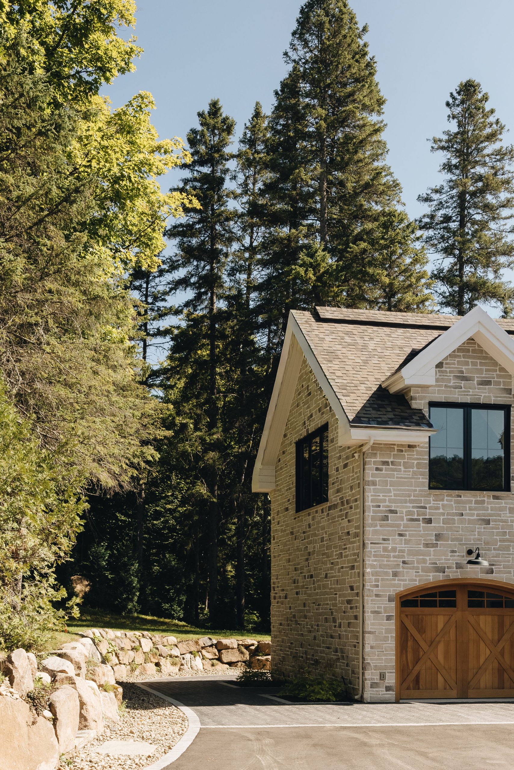 Deux ans après le design du projet Anderson, nous avons conçu un aménagement extérieur en continuité avec l’architecture et le design intérieur de la maison. Le pavé en brique noire, posé en motif herringbone, procure un charme à l’européenne et beaucoup d’élégance aux trottoirs. Les bordures et les joints de sable pâle soulignent le motif et apportent un beau contraste à l’ensemble. Les murets en brique blanche, assortis au revêtement de la maison, accueillent de magnifiques hydrangées qui se parent d’une teinte rosée à l’automne. Ces plantations structurent avec élégance l’aménagement extérieur tout en équilibrant la prestance de la façade. Le demi-cercle de pavé devant le porche fait écho aux arches de l’intérieur.